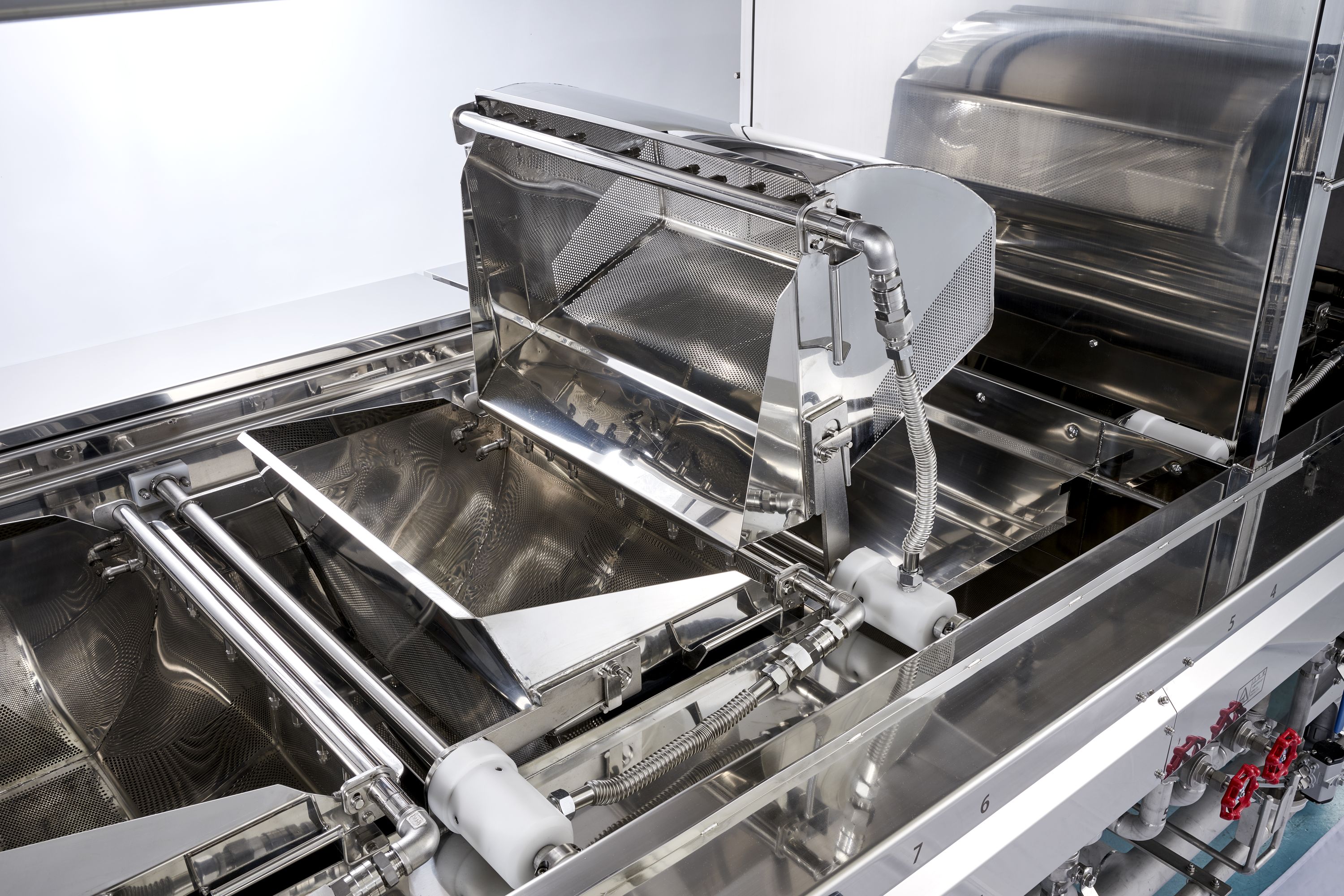 シリンダー駆動式反転装置故障が少ない構造ですので安心してご使用いただけます。次の工程槽に湯(水)を切りながら、商品を自動搬送するのがポイントです。