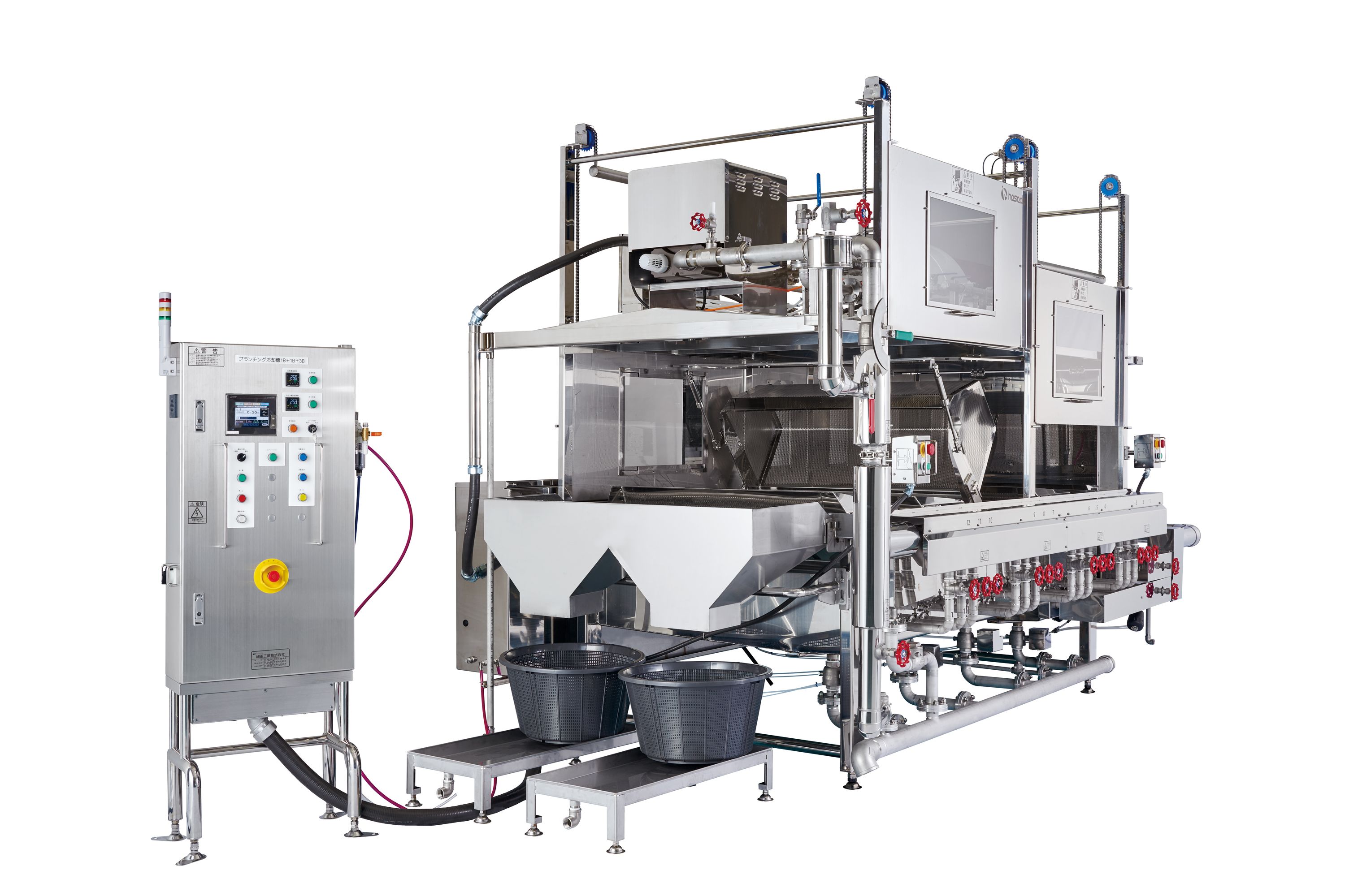 BLANCHING/COOLING MACHINE| 共有仕様 | 本体材質:SUS304 独立型制御盤 篭脱着式 ボイル槽部ポリウレタンSUSカバー断熱仕様 エアレーションパイプ 各槽2本 エアレーション配管殺菌用蒸気殺菌切替バルブ 温度異常警報装置 |